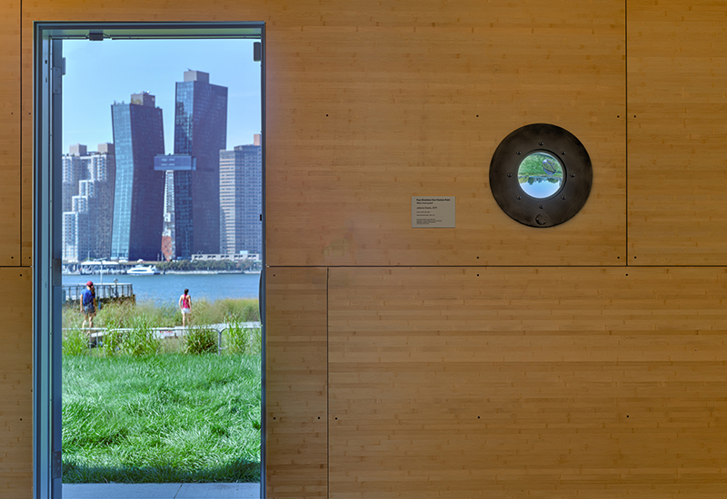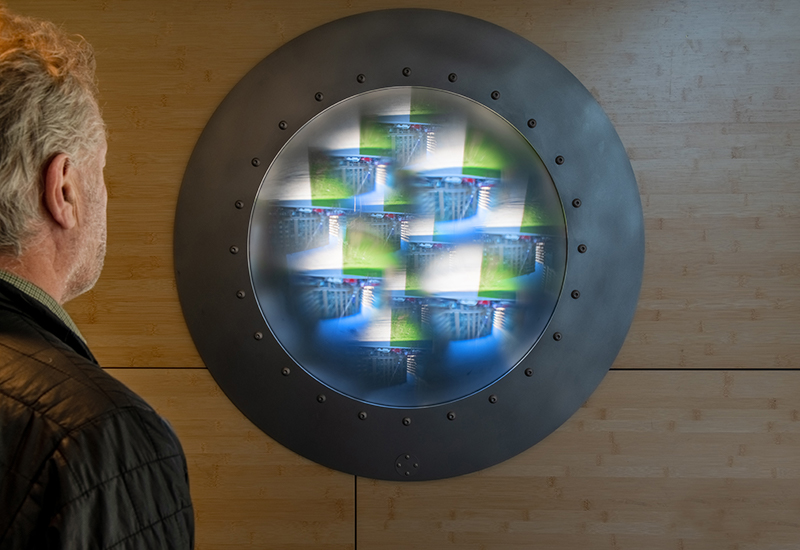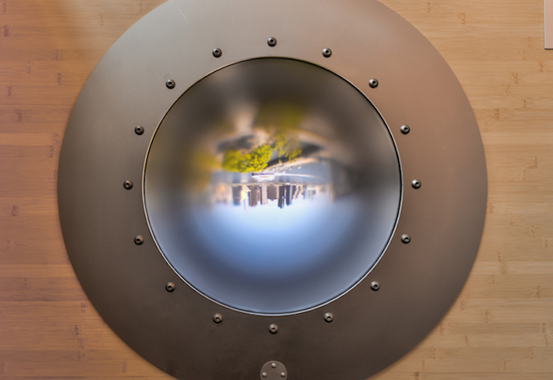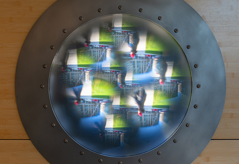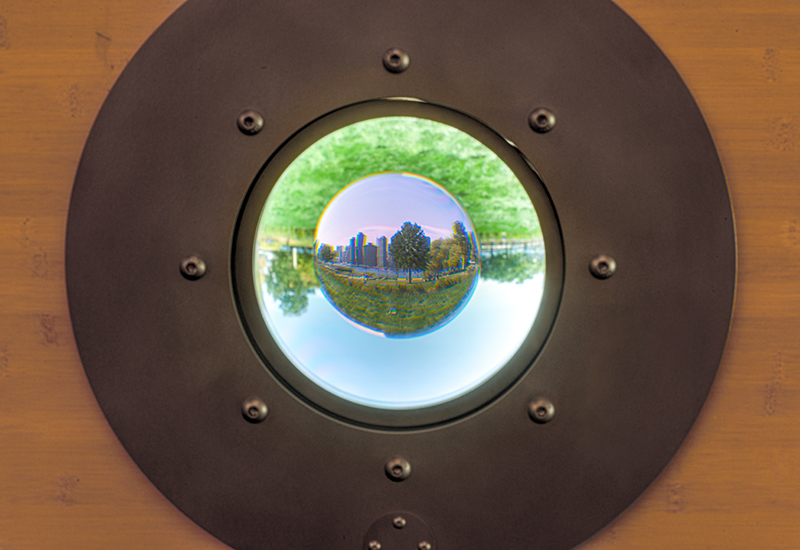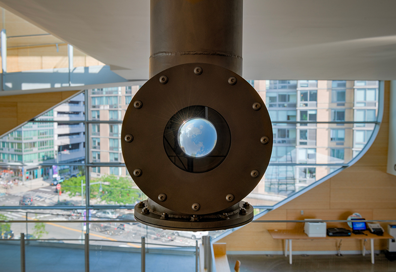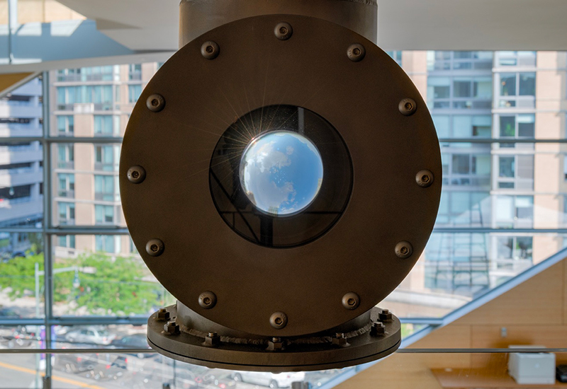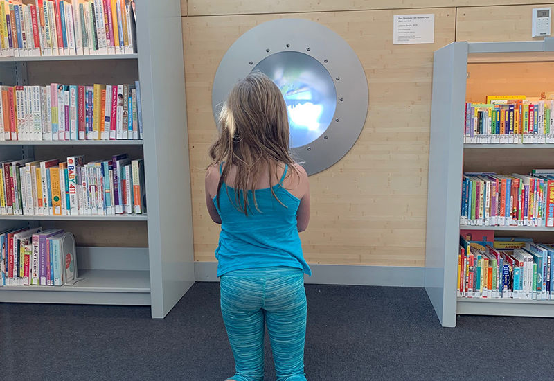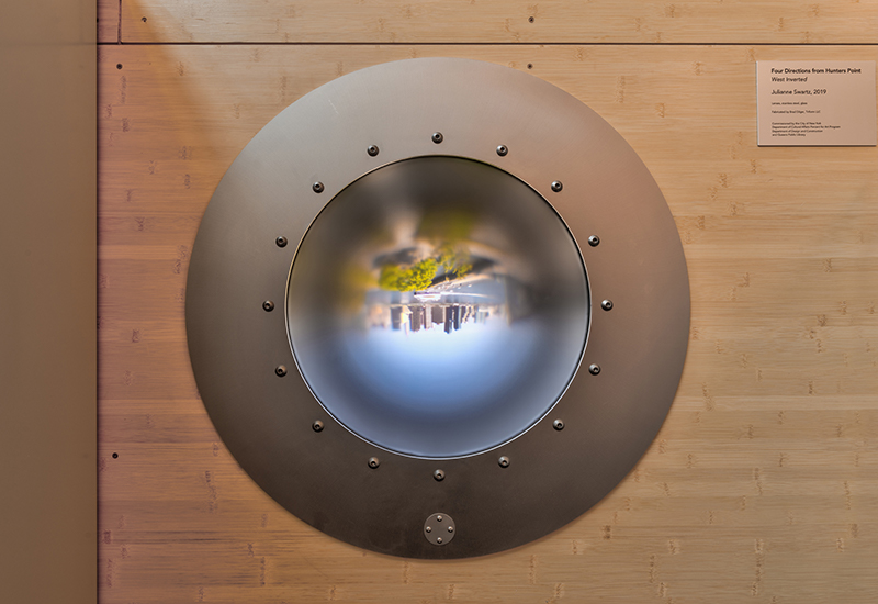 Four optical portals embedded in the walls and ceiling of the Hunters Point Community library. Each portal frames and transforms a different view throughout the library. Each site is subtitled for the direction it looks and the optical transformation that occurs. The images in the portals are ever-changing, dependent on weather and light conditions, and the movement of people and objects in view.