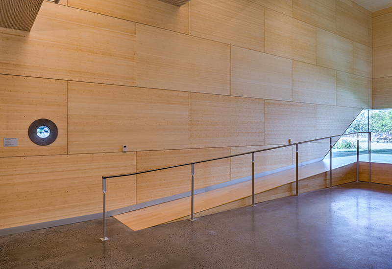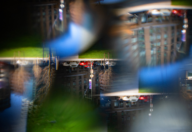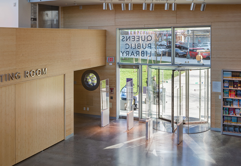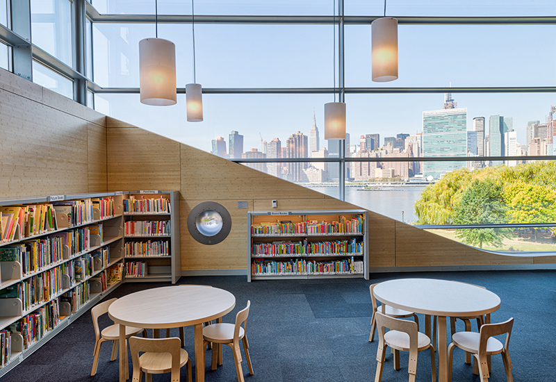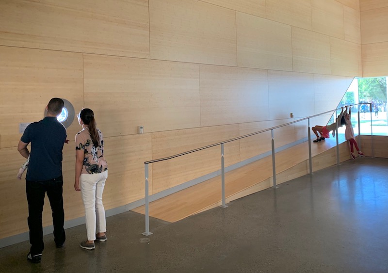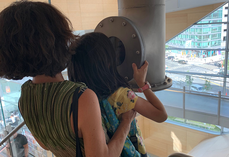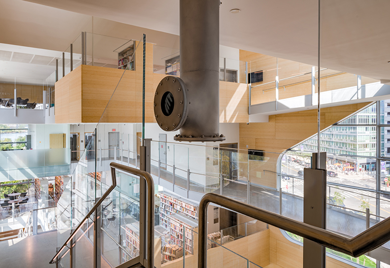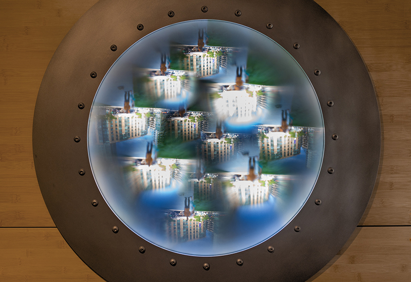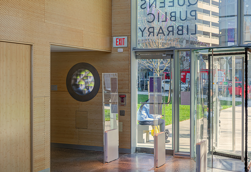 Four optical portals embedded in the walls and ceiling of the Hunters Point Community library. Each portal frames and transforms a different view throughout the library. Each site is subtitled for the direction it looks and the optical transformation that occurs. The images in the portals are ever-changing, dependent on weather and light conditions, and the movement of people and objects in view.