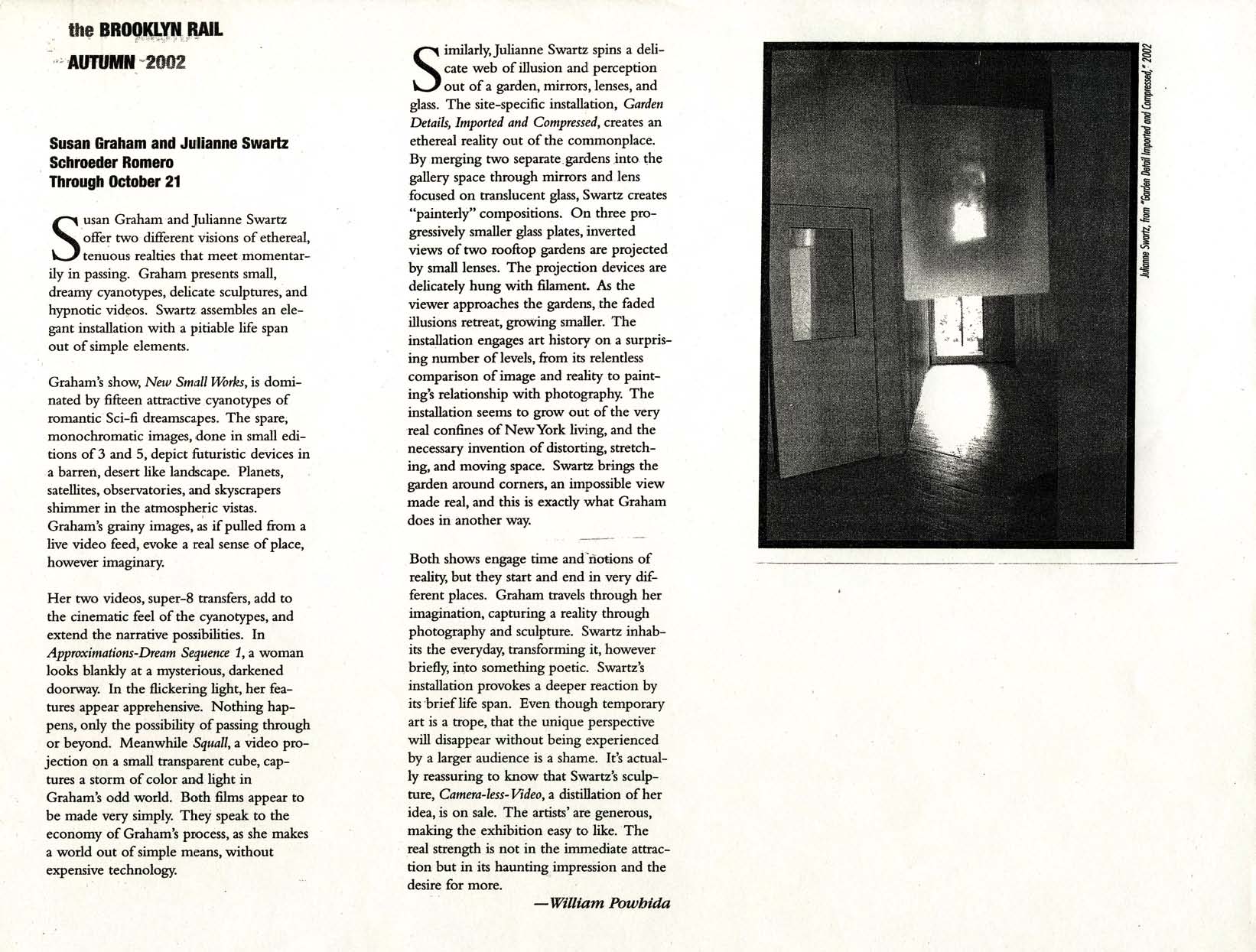 Existing architecture, objects found on site, mirrors, lenses, ground glass screens. Mirrors and lenses transport the scenario of two existing roof gardens into the gallery and invite viewers into the hidden garden spaces.