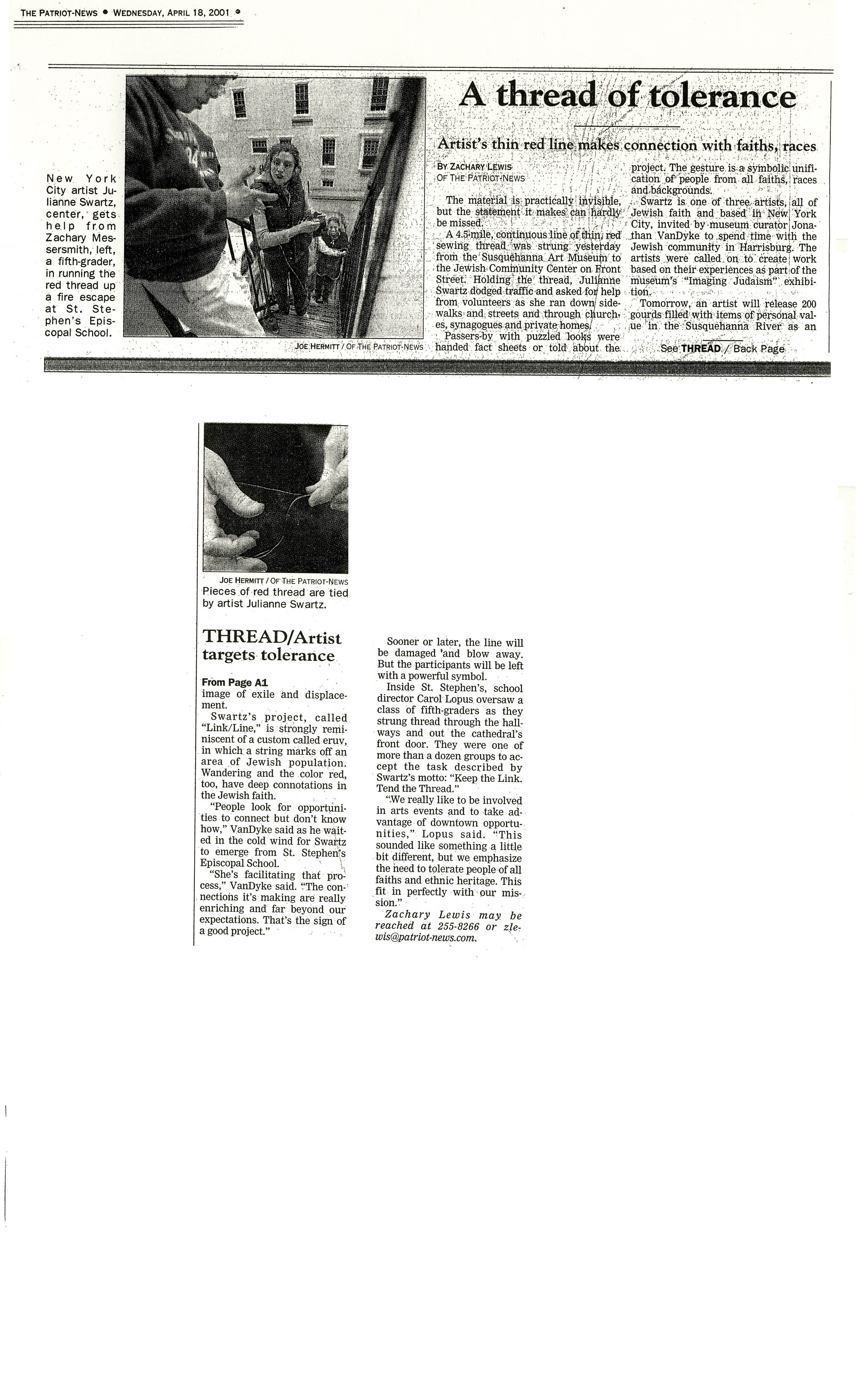A continuous line of red thread was run 4.5 miles through the city of Harrisburg, Pennsylvania. On its route the thread line went through a school, churches, synagogues, an army reserve barracks, places of business and private homes that volunteered to "host" it. Hosts provided a home for the thread while serving as watch-keepers over its safety, tending their designated section of thread for the duration of the exhibition by retying it in the event of breakage.