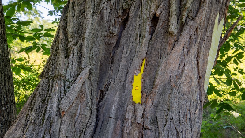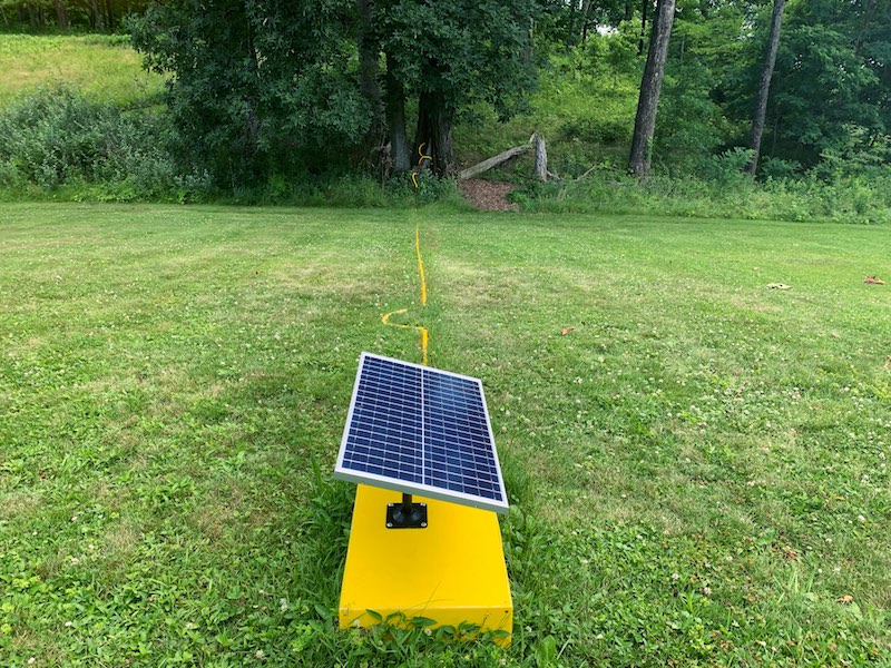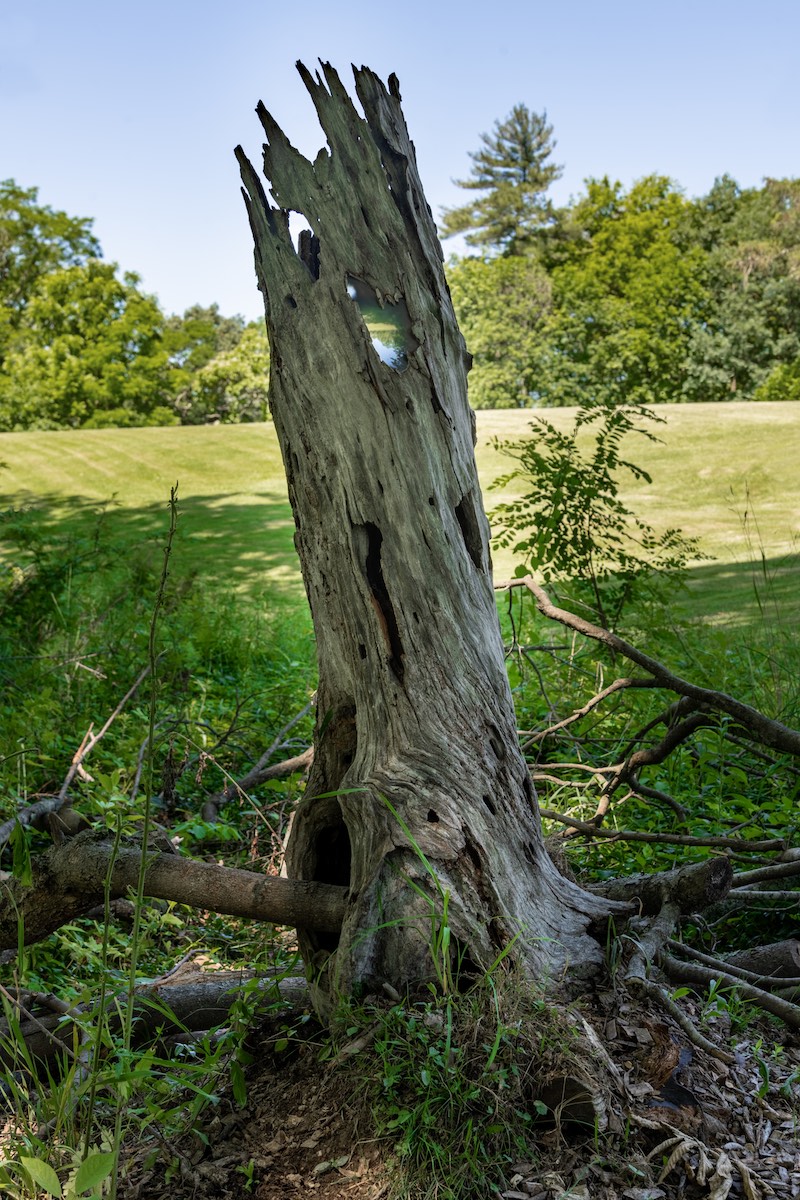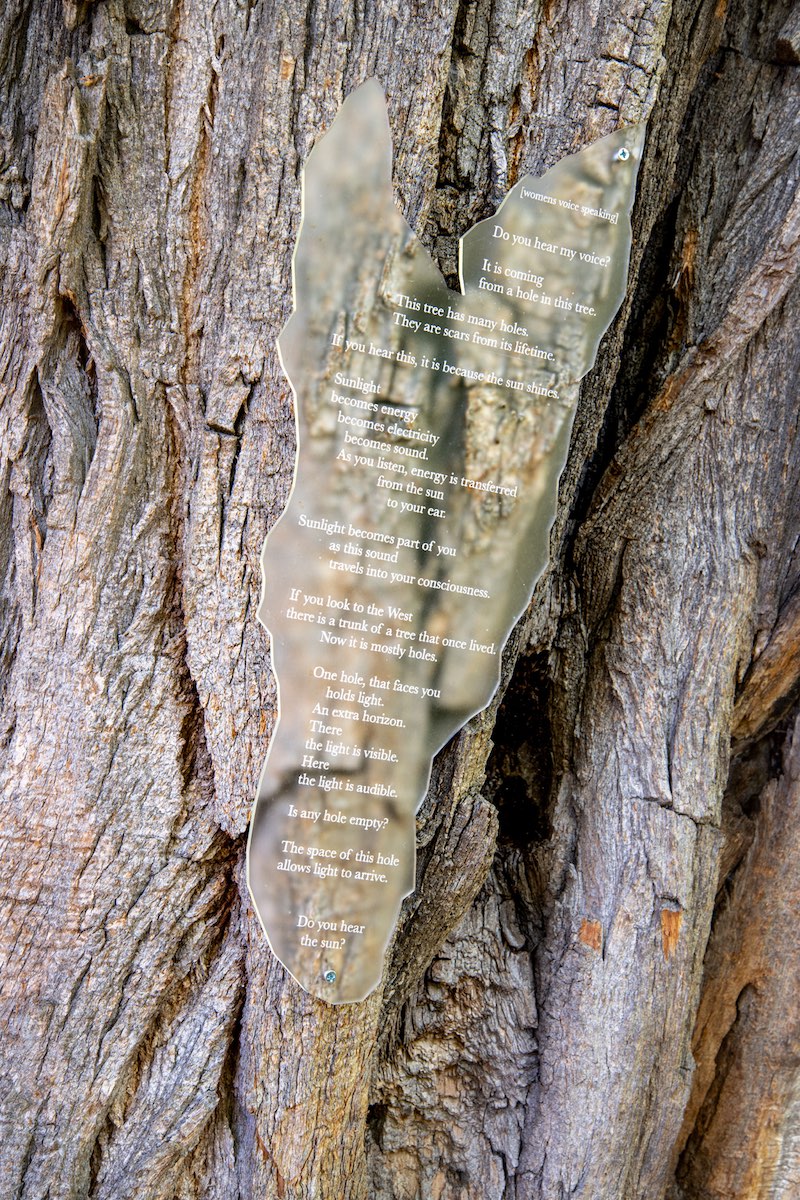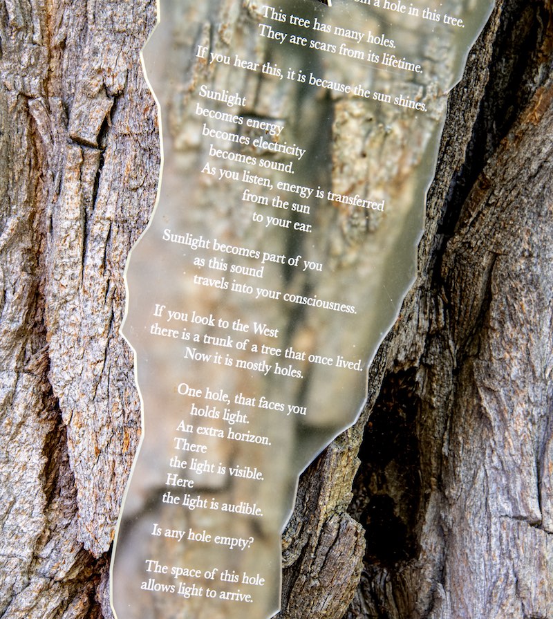 One living tree, one dead tree, solar panel, sunlight, PVC pipe, 1.39 minute soundtrack, optical lens, acrylic, electronics