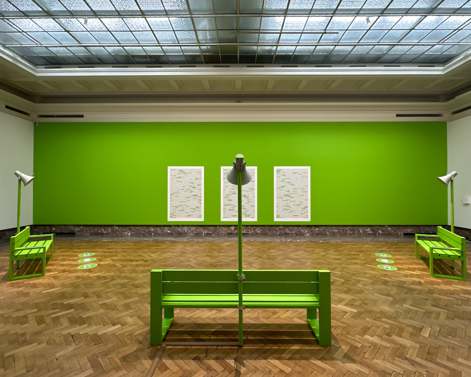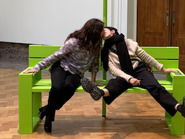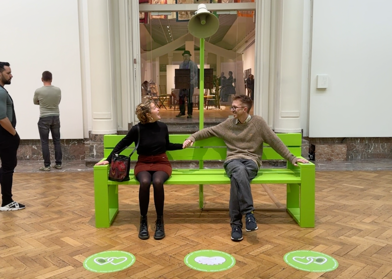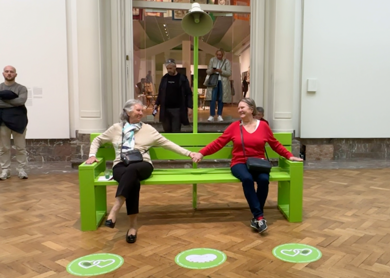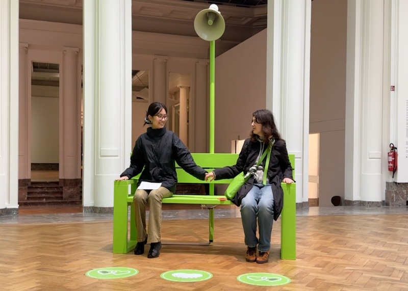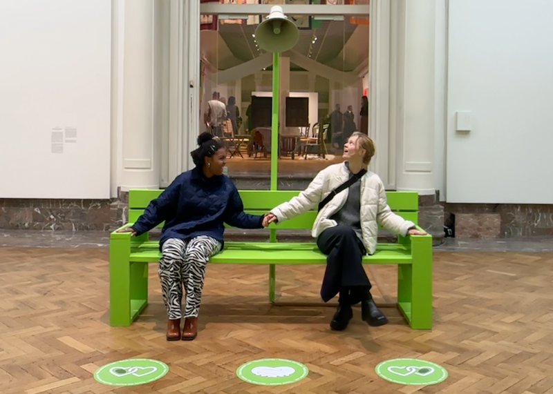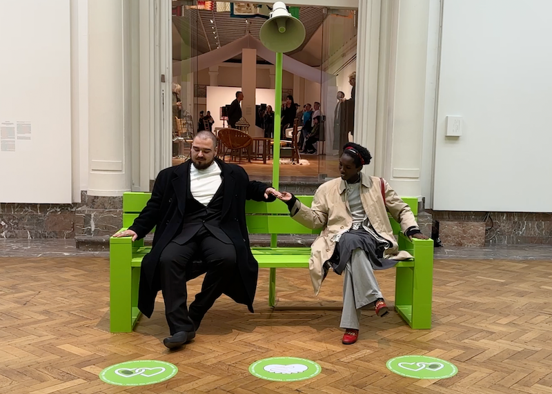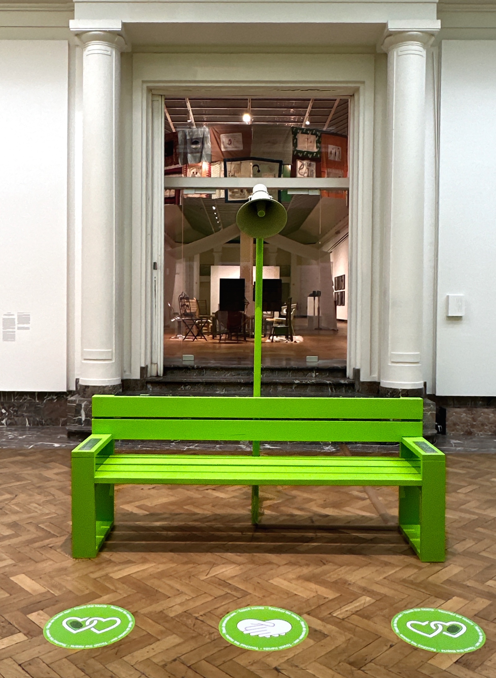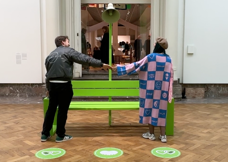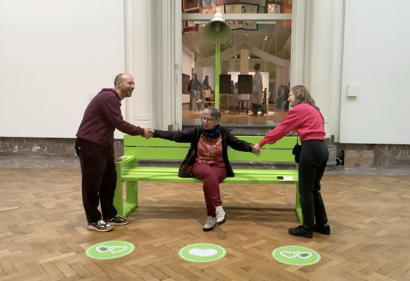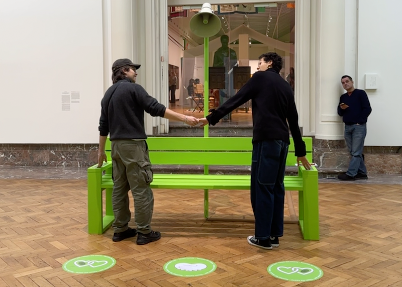 When two or more people use the benches and then touch one another, the electrical charges of their bodies complete a circuit and broadcast a soundtrack. If no one touches, the benches are quiet. Visitors can touch one another to activate the three tracks independently and concurrently, cooperatively composing and layering sound to fill the room.