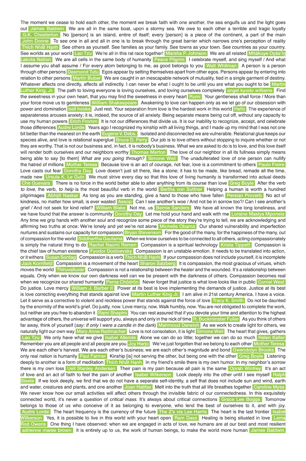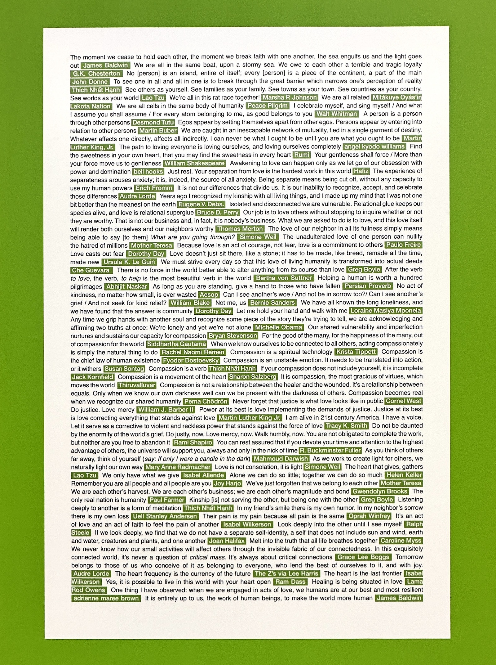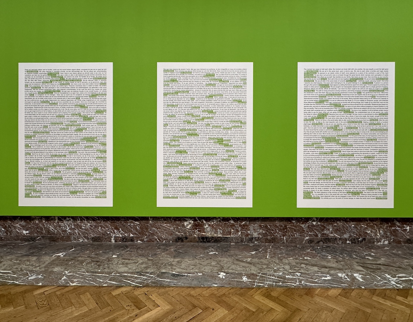 The sound is young voices speaking 88 quotations from a wide range of poetic, literary, psychological, political and spiritual sources ranging from approx 500 BC to 2024. The text moves through themes of Interdependence, Care, Compassion, Loving Community, Justice, Healing, the Heart, and the Future. 90 children and teens, aged 6-17, read quotes for the soundtrack, speaking in Flemish, French, and English. The quotations and sources are formatted into three giant posters, one in each language.